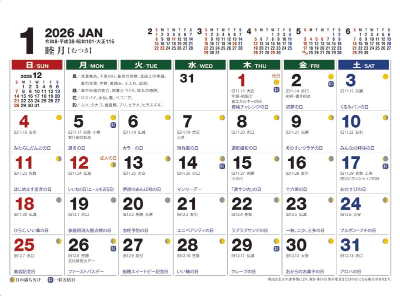- 六曜、通し元号、二十四節気、旧暦、一粒万倍日、月の満ち欠け、農事暦、記念日(日本記念日協会監修)、前後月カレンダーを掲載
