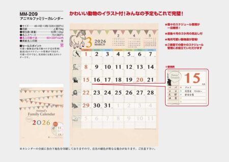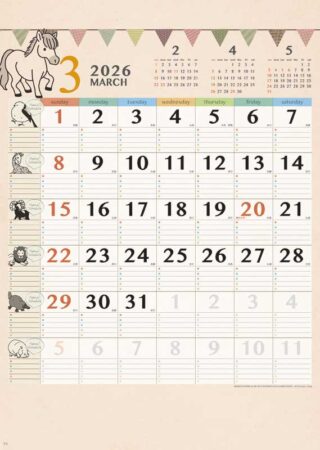 かわいい動物のイラスト付き!みんなの予定もこれで完璧!かわいい動物たちが毎月個々の予定を管理!最大5名のスケジュール管理ができます。かわいいだけでなく、実用的にも使えるカレンダーです。六曜、前後月のカレンダーを掲載。