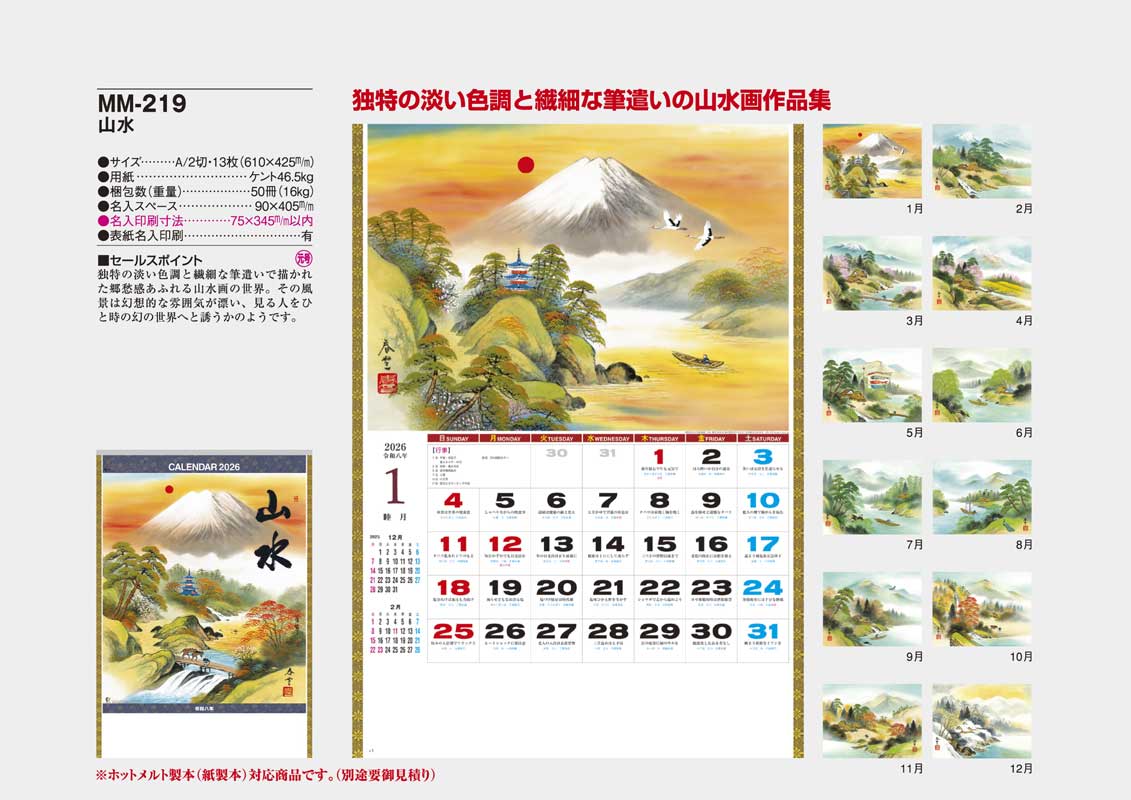 独特の淡い色調と繊細な筆遣いで描かれた郷愁感あふれる山水画の世界。その風景は幻想的な雰囲気が漂い、見る人をひと時の幻の世界へと誘うかのようです。六曜、元号、行事、前後月カレンダーを掲載。