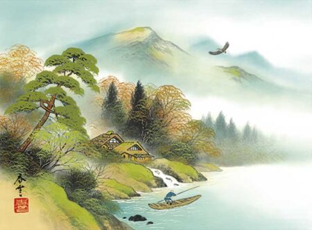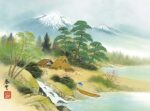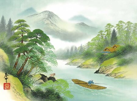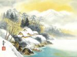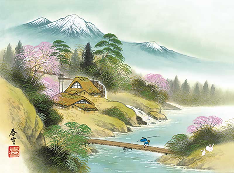 独特の淡い色調と繊細な筆遣いで描かれた郷愁感あふれる山水画の世界。その風景は幻想的な雰囲気が漂い、見る人をひと時の幻の世界へと誘うかのようです。六曜、元号、行事、前後月カレンダーを掲載。