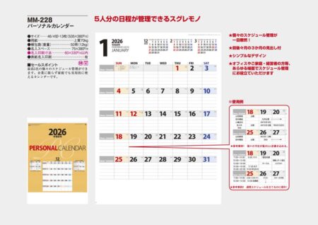 5人分の日程が管理できるスグレモノ。前後々月の3ヶ月の見出し付きのシンプルなデザイン。企業に限らずご家庭でも実用的に使えるカレンダーです。六曜、元号、行事、前後月カレンダーを掲載。最高5名の個々のスケジュールを管理。