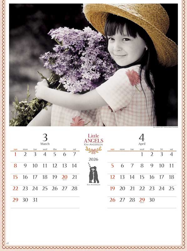 写真家キム・アンダーソンによる、ちょっぴりおしゃまな子どもたち!2ヶ月表示カレンダー、環境にやさしいミシン目の入りのエコプレス製本(ホットメルト製本)。六曜なしのシンプルなカレンダー。