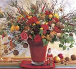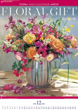 大好評の高級感あふれるフラワーアレンジメントをワイドな画面で!!2ヶ月表示カレンダー、環境にやさしいミシン目の入りのエコプレス製本(ホットメルト製本)。元号・六曜を掲載。