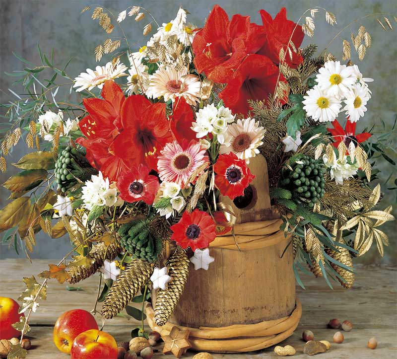 美しくいけられた花々が日々を彩ります!1ヶ月表示カレンダー、書き込みやすい罫線入りのメモ・スペース、環境にやさしいミシン目の入りのエコプレス製本(ホットメルト製本)。六曜・後月カレンダーを掲載。植林パルプを配合した用紙・無塩素漂白パルプを使用。