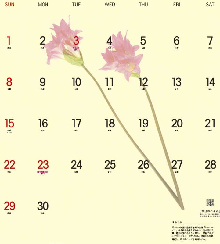 押し花をあしらった上品な印象のカレンダー!1ヶ月表示カレンダー、環境にやさしいミシン目の入りのエコプレス製本(ホットメルト製本)。QRコードから毎日読める「今日のこよみ」・押し花の説明・六曜を掲載。