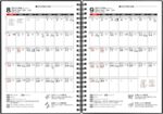 週単位で記録が残せる、A5サイズ・リング製本の1週間タイプ(月曜始まり)。左ページが週間予定表、右ページがフリースペース。1か月の予定が一目でわかる月間ブロック。表紙は黒(再生PP)。専用のし袋付き。暦の雑学、暦早見表(九星・六曜・十干十二支など)、世界時差表/長寿の祝/結婚記念日、年齢・和暦・西暦早見表、金運吉日一覧(一粒万倍日・天赦日など)、七十二候一覧、晴雨表、災害時の安否情報・連絡方法、JR・私鉄路線図(東京・大阪・名古屋)、地下鉄路線図(東京・大阪・名古屋・札幌・横浜・仙台・神戸・京都・福岡)、高速道路図(首都高速道路・阪神高速道路・名古屋高速道路)、全国高速道路図、世界地図と時差表、日本全図付き。