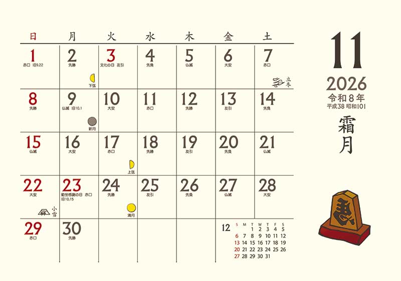 - 「令和・平成・昭和」の元号・後月カレンダー・六曜・二十四節気・雑節・行事・旧暦・三りんぼう・歳時記・月の満ち欠け・一粒万倍日・今年と翌年の年表を掲載