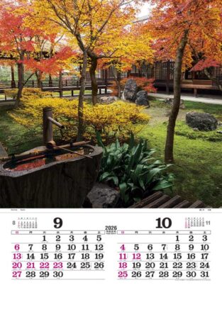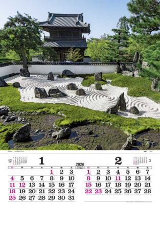 自然の美しさと、日本人の感性を調和させ、幽玄かつ端整な美へと昇華させた庭のカレンダー。絵柄部分にフィルム素材を使用することで、紙では表現できない透明感のある美しさを実現。「令和・平成・昭和」の元号・前後月カレンダー・六曜・二十四節気・雑節・旧暦・三りんぼうを掲載。