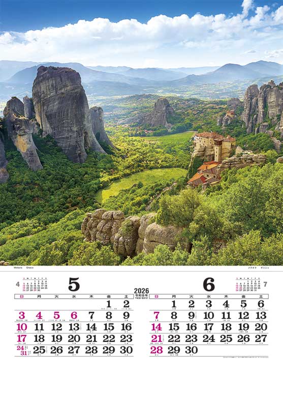 情緒ある世界の景色が堪能できるカレンダー。絵柄部分にフィルム素材を使用することで、紙では表現できない透明感のある美しさを実現。「令和・平成・昭和」の元号・前後月カレンダー・六曜・二十四節気・雑節・旧暦・三りんぼうを掲載。
