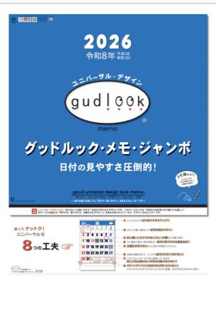 ユニバーサルデザインカレンダーのジャンボサイズ。文字に強弱をつけ見やすい行事欄。目に優しいブルーの罫線のメモ欄。太い書体と際立つ発色の黒で見やすい数字。縁取りではっきり見える土曜の青い数字。前後月カレンダーを見やすく下部に配置。「令和・平成・昭和」の元号・前後月カレンダー・六曜・二十四節気・雑節・行事・三りんぼう・一粒万倍日を掲載。6週目が見やすい6週表示カレンダー。前後の月が分かりやすい三角マーク、先の月を探すのに便利なUDインデックス入り。
