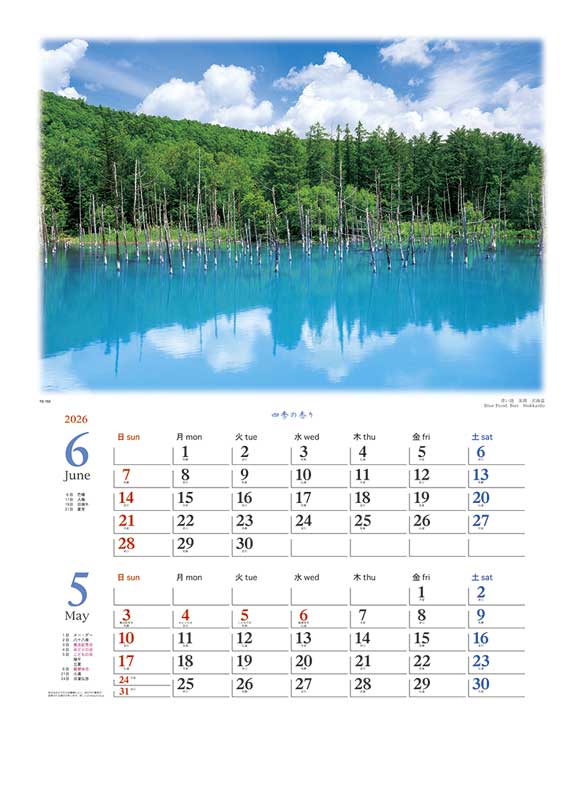 月と月の間にはミシン目が入ったいつでも2ヶ月表示のカレンダー。美しい日本風景と実用性を求める方にお勧めします。六曜・二十四節気・雑節を掲載。植物油インキ、無塩素漂白パルプを使用。