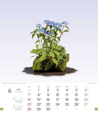 山野草で作る「草もの盆栽」のカレンダー。樹木盆栽とは一味違う、可憐な佇まいをお楽しみください。前後月カレンダー・六曜・二十四節気・雑節・月の満ち欠けを掲載。前後の月が分かりやすい三角マーク、先の月を探すのに便利なUDインデックス入り。