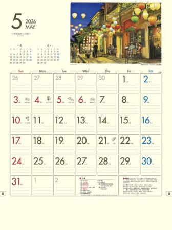 タッチの細かさと色使いに思わず見惚れてしまう、ペン画の世界遺産カレンダー。大人のぬり絵本で活躍されている作家、杉井洋一氏による作品。前後月カレンダー・六曜・二十四節気・雑節・行事・三りんぼう・歳時記・行事アイコン・一粒万倍日を掲載。6週目が見やすい6週表示カレンダー。前後の月が分かりやすい三角マーク、先の月を探すのに便利なUDインデックス入り。植物油インキ、無塩素漂白パルプを使用。