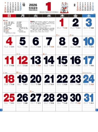 数字もメモも見やすいカレンダー。表紙は名入れして丸めると贈答に便利な「のし」付き。表紙は10月からの15ヶ月間の年間カレンダー、裏表紙面には年間予定表(晴雨表)付き。縁起の良い招き猫を毎月掲載。忘れがちな行事、記念日をイラストのアイコンで表示。今年の干支の動物がすぐわかる十二支スケール付き。太い書体と際立つ発色の黒で見やすい数字。縁取りではっきり見える土曜の青い数字。罫線で書き込みしやすいメモ欄。「令和・平成・昭和」の元号・前後月カレンダー・六曜・二十四節気・雑節・行事・九星・旧暦・十干・十二支・三りんぼう・歳時記・行事アイコン・干支の動物アイコン・一粒万倍日を掲載。5週目も6週目が見やすい5&6週表示カレンダー。先の月を探すのに便利なUDインデックス入り。植物油インキを使用。