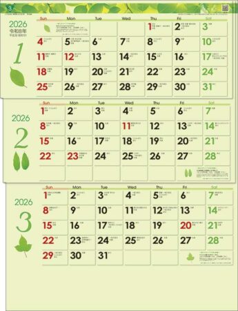 環境保護を表現する色でもある綺麗なみどり色の再生紙を使用したカレンダー。簡単にできる省エネのワンポイント・アドバイスを毎月掲載。「令和・平成・昭和」の元号・六曜・二十四節気・雑節・行事・三りんぼう・一粒万倍日を掲載。2ケ月先まで上から一覧で見ることができる上から順3ヶ月タイプ。翌年2月までの14ケ月カレンダー、翌年の年表付き。今日の日付が一目でわかるスライド日付マーカー付き。植物油インキ、無塩素漂白パルプ使用。