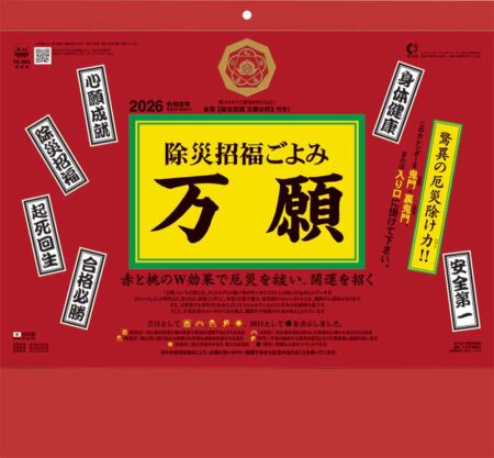 赤色と桃のW効果で厄災を祓い、開運を招くカレンダー。邪気が入ってくるとされる鬼門(北東)、裏鬼門(南西)または部屋や建物の入り口に飾りお使いください。万願の印入り。「令和・平成・昭和」の元号・後月カレンダー・六曜・吉日アイコンを掲載。